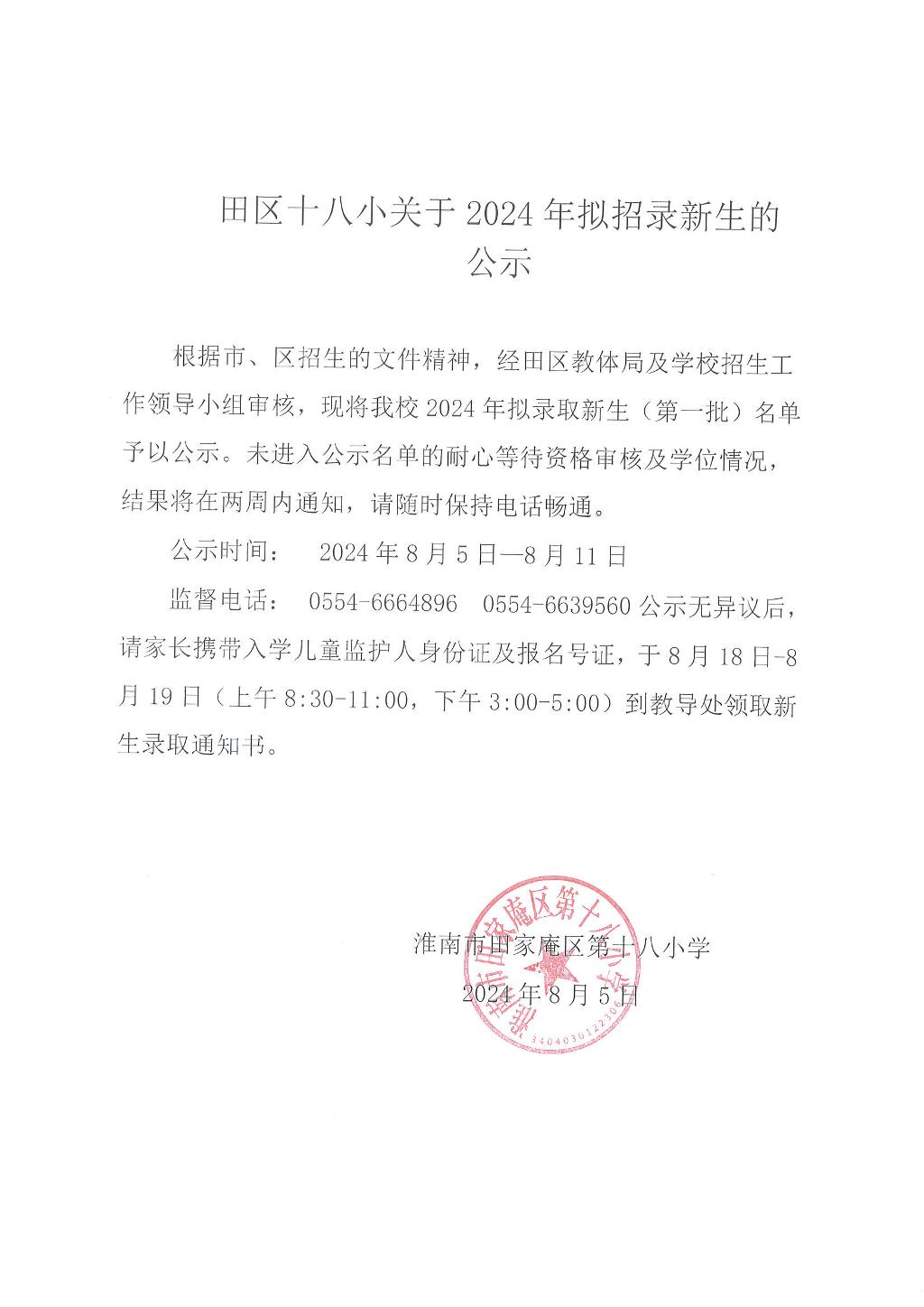 田区十八小关于2024年拟招录新生的公示