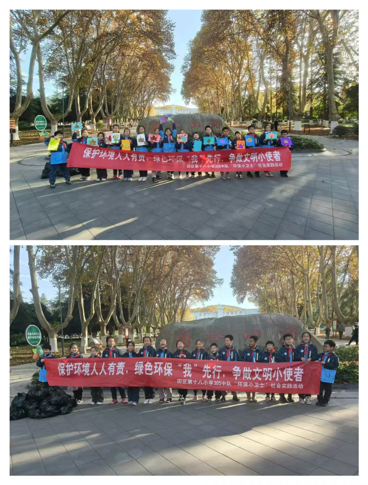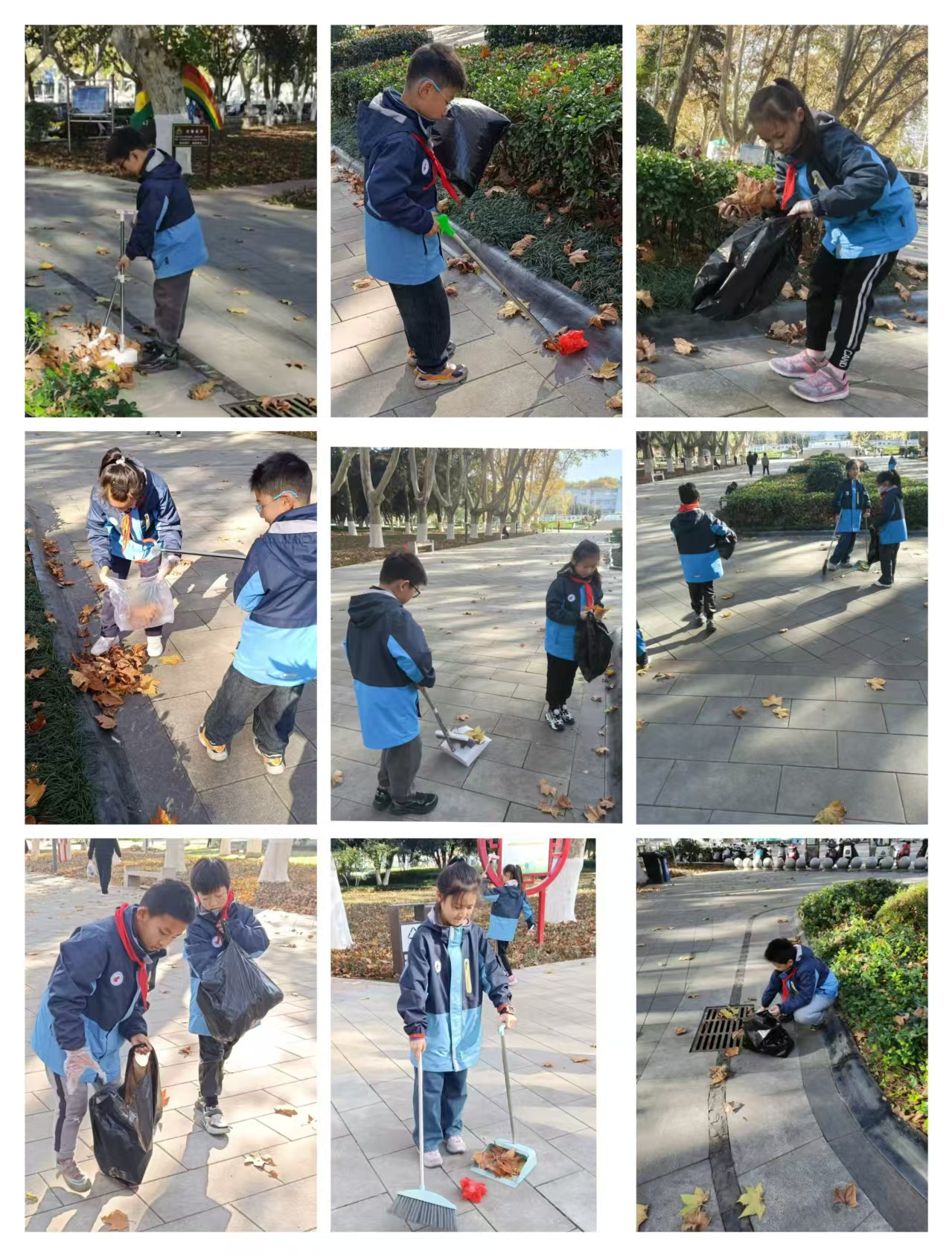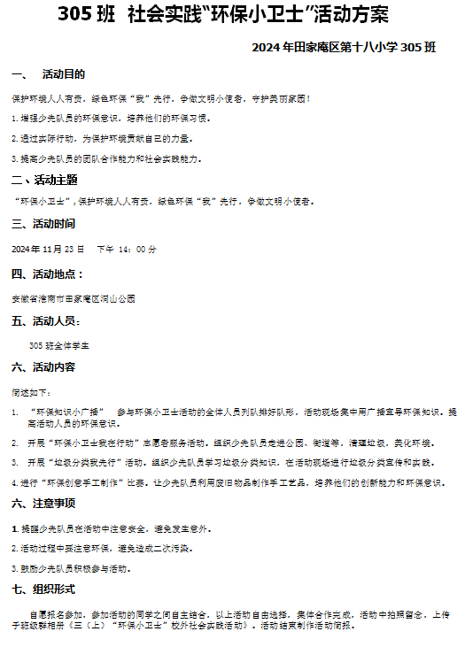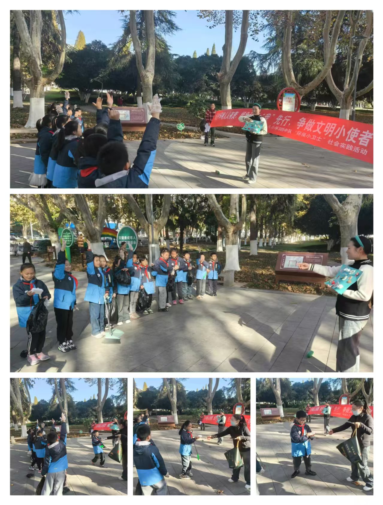 2.开展“环保小卫士我在行动”志愿者服务活动。组织少先队员走进公园、街道等,清理垃圾,美化环境。